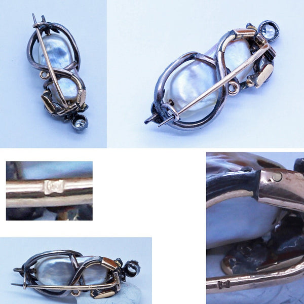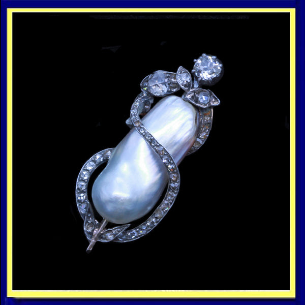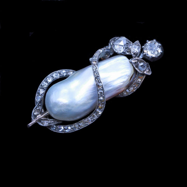 Description : Naturalistic, organic design, like a large fruit with a stem winding around it. The main body is a large natural baroque pearl, with a delightfully full shape like a ripe fruit. One side with Old European Cut diamonds forming leaves and flowers and then ribbons of rose cut diamonds winding around the pearl, like a twisting vine. C-clasp to the pin. A small gold loop indicates that the brooch could also be used as a pendant.