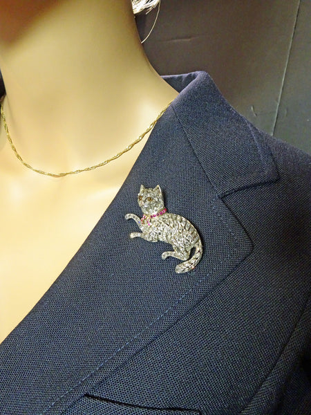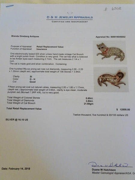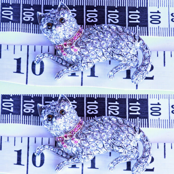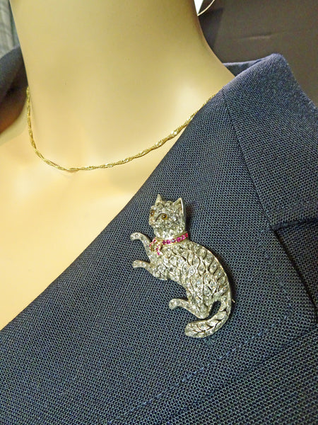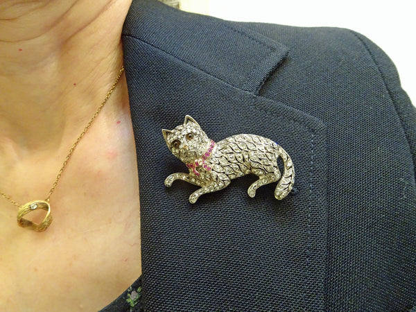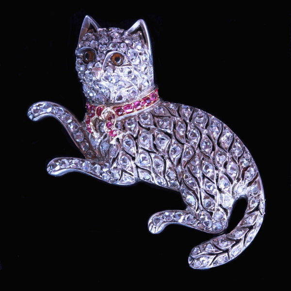 Brooch in the form of a cat. Realistically modelled with a bushy tail and fine features. The cat is entirely set with diamonds. Typical of antique jewelry, diamonds are set in a layer of silver over a layer of gold. This showed the diamonds off more advantageously in candle or gas light. The gold protected the ladie's clothes from the tarnish of silver. The little metal cells containing the diamonds seem to float independently and the spaces in-between them give the impression of the luxurious undulating lines of a cat. We can almost feel the creature breathing. It wears a beautiful collar tied with a bow of red rubies, set in gold. The eyes are believed to be amber and are entirely realistic. Gold tip of the nose. The cat looks as though it has just pawed at a person or toy and looks ahead as though questioning or challenging the viewer. Back and clasp are gold. Very beautiful workmanship. The ultimate brooch for any cat-lover.