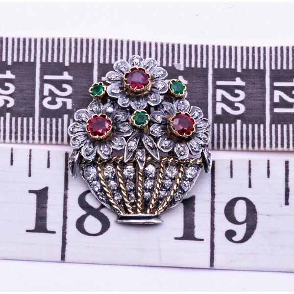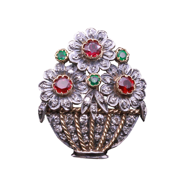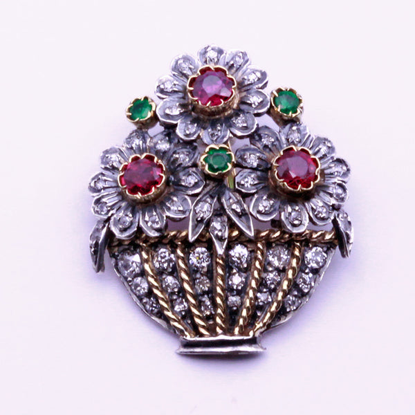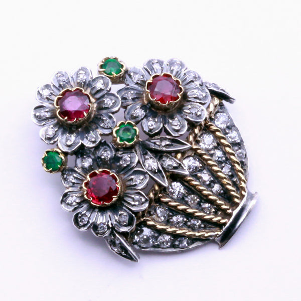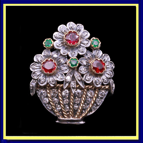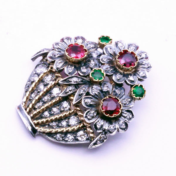 A basket/vase of flowers composed of alternating lines of diamonds and rope-twist raised borders of yellow gold. Flowers and foliage with 3 deep red rubies and 3 smaller round emeralds, all set in yellow gold forming the centers of the flowers. Petals and foliage surrounding them are entirely set with diamonds. Classic, understated and smart. Will look good going to work, to a party or any function where you want to subtly stand out from the crowd.