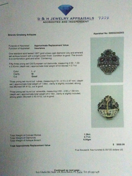 Measurements: Weight is 6.0 grams. 1.26ct rubies and emeralds; 0.71ct diamonds. Please see independent appraisal for details.