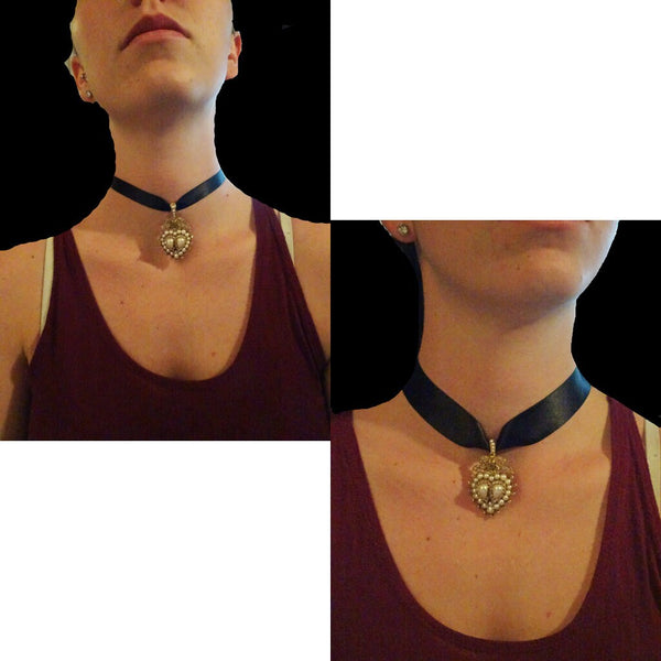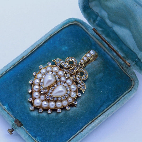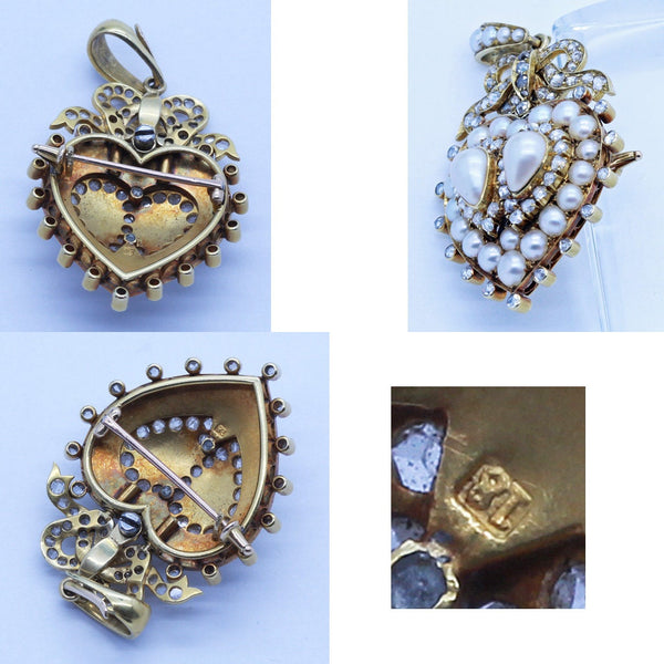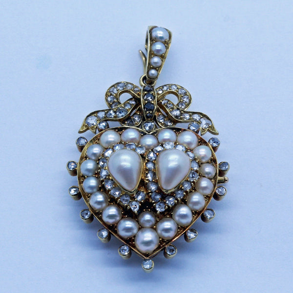 Description : Exquisite romantic and sentimental jewel. A tapering bale, sturdily crafted and set with line of graduated pearls. Links connect to an upper bow - a ribbon tied with a central knot, all constructed in yellow gold and rose cut diamonds. This section can be removed and the parts worn seperately as there is a screw (probably a replacement) and little gold bars that fit into the main body of the jewel. These gold bars would simply be lifted up and the bow and heart seperated.