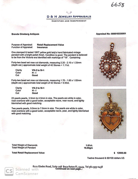 The main body of the pendant/brooch is a magnificent, luxurious heart - in fact multiple hearts within hearts. A huge statement of love, affection, romance and sentiment. A pear of very big heart-shaped pearls are raised aloft above a border of rose cut diamond hearts, one overlapping and entwining the other in a further romantic statement. These are surrounded by a heart-shaped border of beautiful pearls, very finely set so that only the outer mount of yellow gold can be seen. Collette-set diamonds are set at stations around this to further catch the eye and finish off the jewel with a final flourish of lavish luxury.