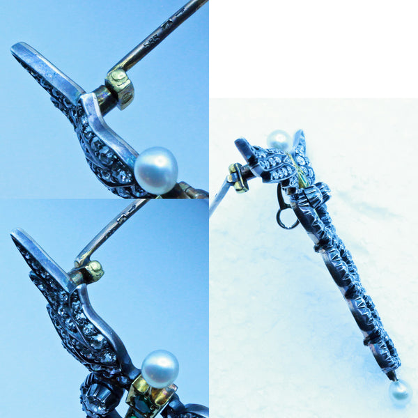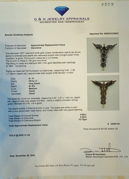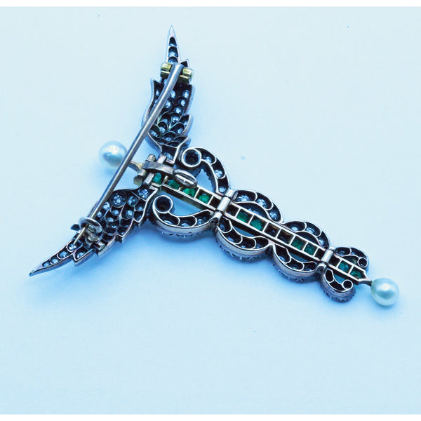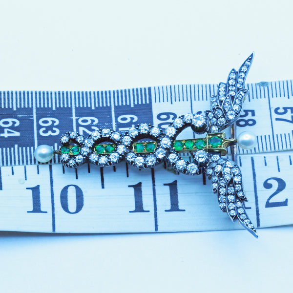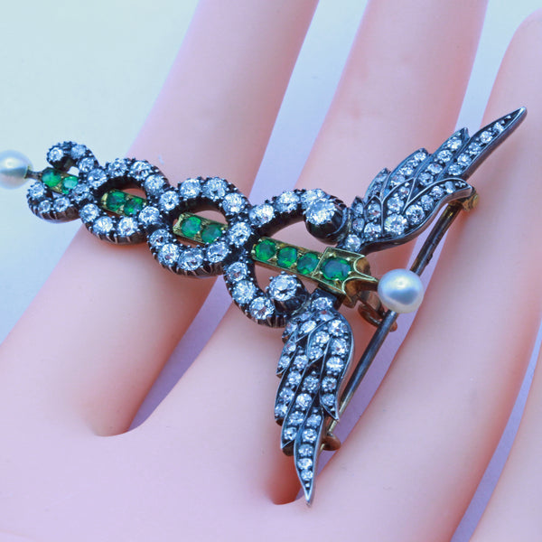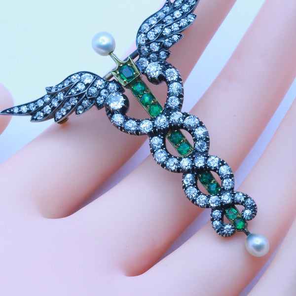 Antique Victorian caduceus brooch pendant. Gold, silver, diamonds, emeralds, pearls. Made circa 1880. Unisex - suitable for a man or a woman.