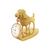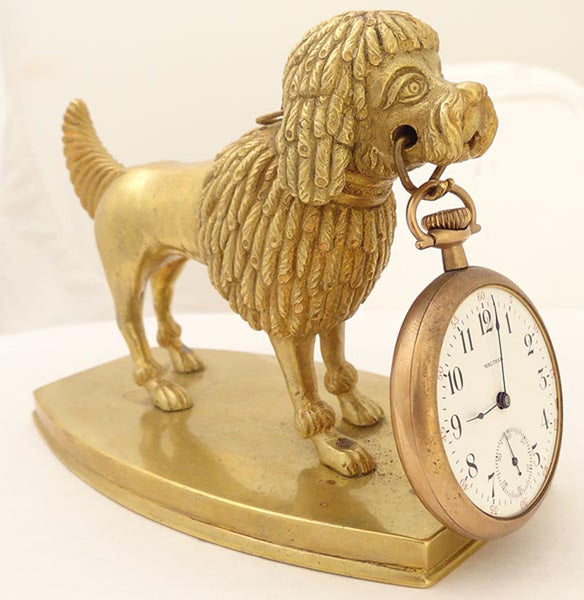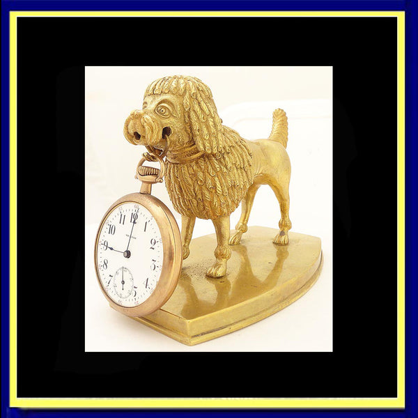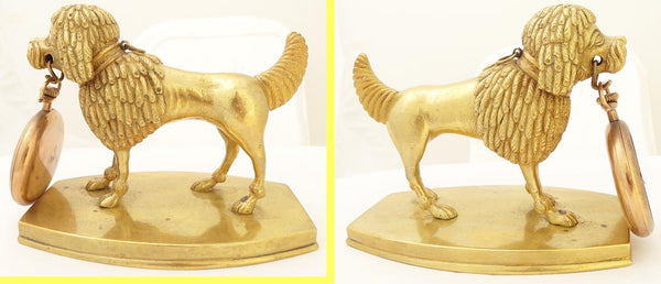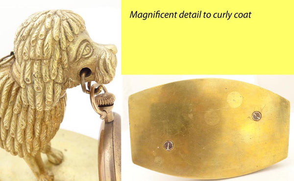 Ormolu (gilt bronze) sculpture of a dog, either a French poodle or a curly-coated Spaniel such as a Cavalier King Charles Spaniel. He stands on a gilt bronze base, oval with truncated ends. The legs and back of the dog have been shaved in true poodle style, Leaving a shaggy mane and head, fanning tail and pompoms above feet. The long full tail and floppy ears hint more at the Spaniel family than a poodle, but dog styles have changed over the last 200 years. The coat is fabulous: curls and curls of gold. A fine collar with a loop around his neck. Loop under mouth to hold a pocket watch.