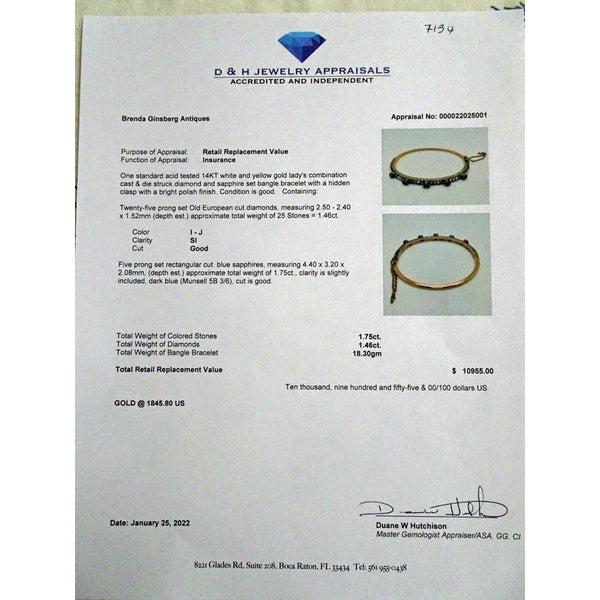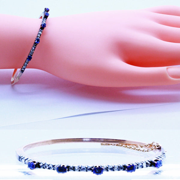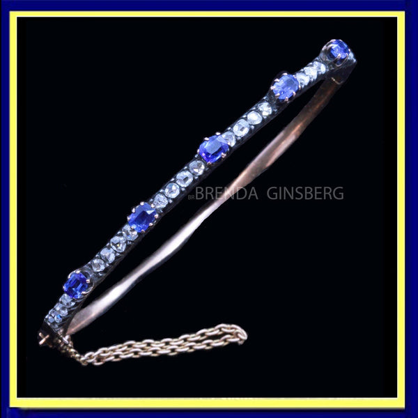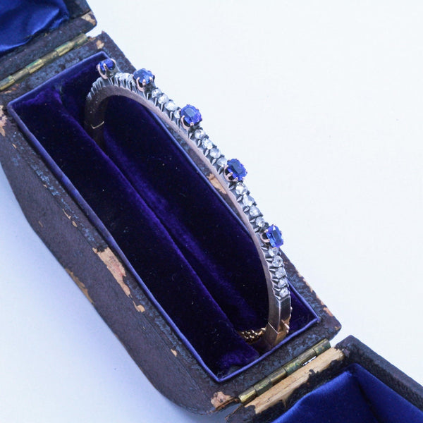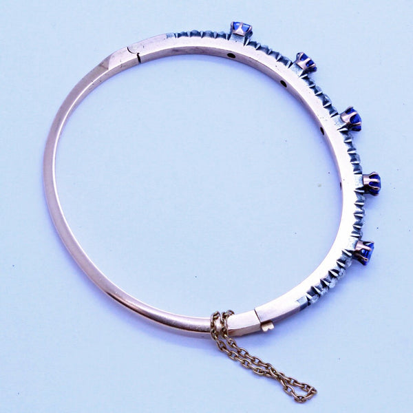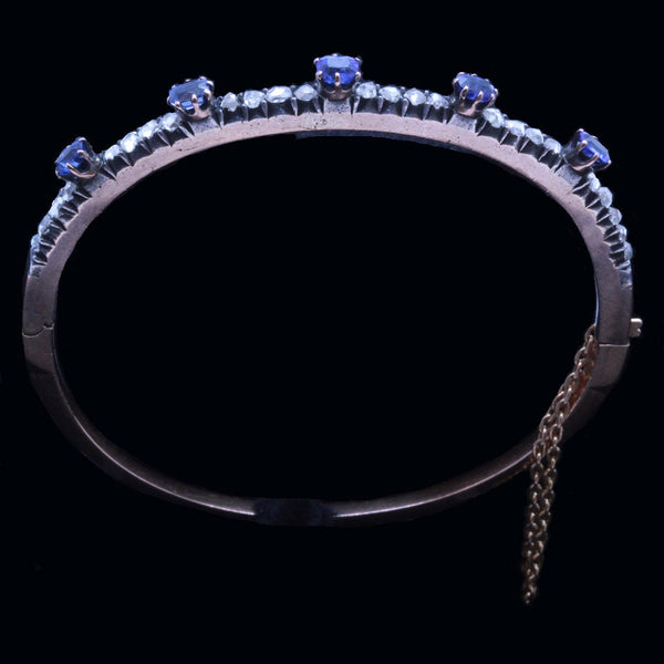 Description : Rose gold bangle with hinge on one side and tongue-in-groove clasp on the opposite side. Upper surface with finely set band of Old European cut diamonds alternating with 5 stations of raised deep blue sapphires. Diamonds are set in silver, which is typical of antique jewelry - diamonds were considered best shown off when mounted in silver. The layer of silver over gold dates the bangle firmly in the Victorian era. Sapphires are mounted in gold, which rises like cups or flowers above the level of the diamonds and holds the sapphires, which are like the petals of the flower. Sapphires are rectangular, emerald cuts. A gold safety chain adds security.
