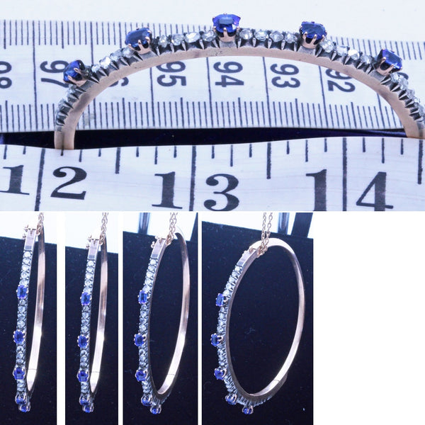 Measurements: Weight is 18.3 grams. Very difficult to measure exact inner diameter, which is approximately 6 1/2 - 7 inches (17.5cm). Fits my wrist (6 1/2inch) with lots of lefover space. 1.75ct sapphires. 1.46ct diamonds.