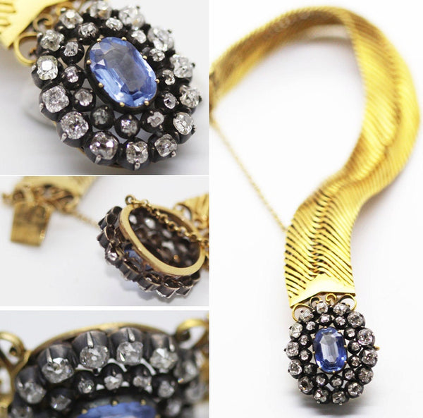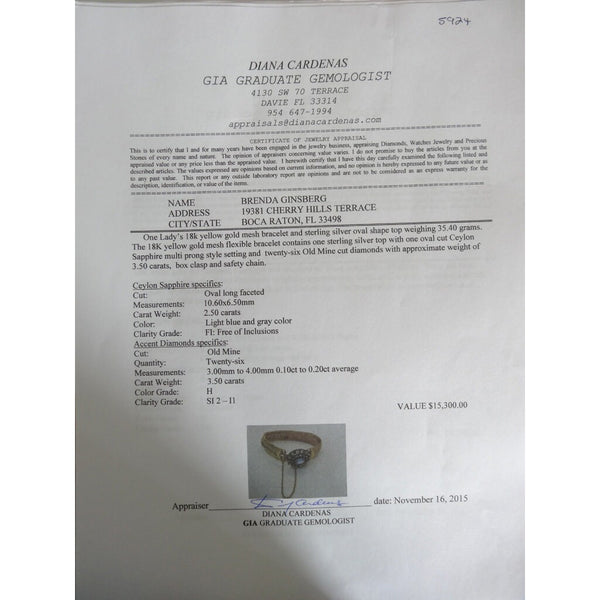 Measurements: Gold band is 1/2 inch (13.5mm) wide. Length is 7 3/4 inches (20cm). Weighs 35.3grams. Ceylon Sapphire approximately 2.50ct. Sapphire appraised as free of inclusions. Old mine cut diamonds approximately 3.50ct.