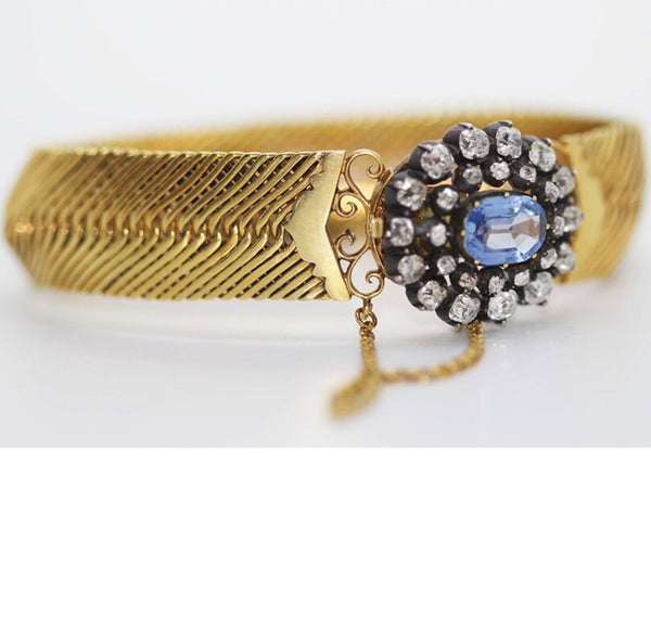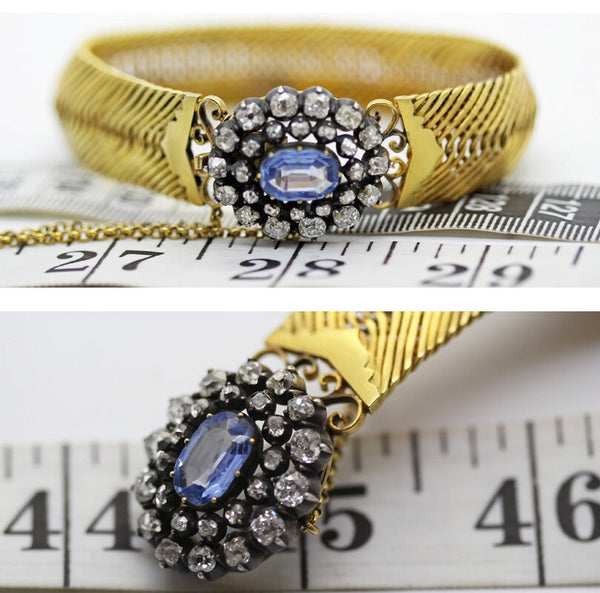 Antique Victorian bracelet bangle. 18k Gold, silver, diamonds and sapphire. Made circa 1880. Believed to be made in England.