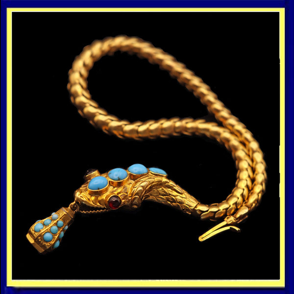 Snake bracelet. The body tapering towards the tail, each segment articulated and overlapping the next, so that the bracelet is luxuriously flexible. Conveys a realistic scaly appearance. Head with engraved scales and textured detail. Cabochon garnet eyes and 4 cabochon garnets set in the head.  A pyramidal gold drop is inset with turquoise cabochons on each side and an amethyst underneath. Fine engraved additional detail.