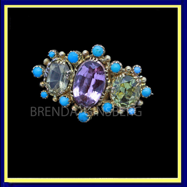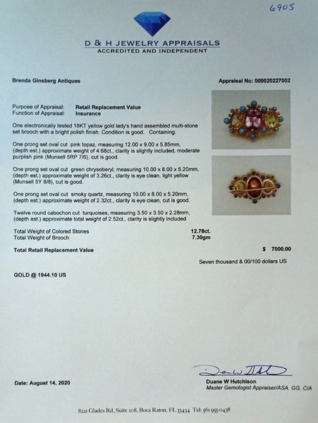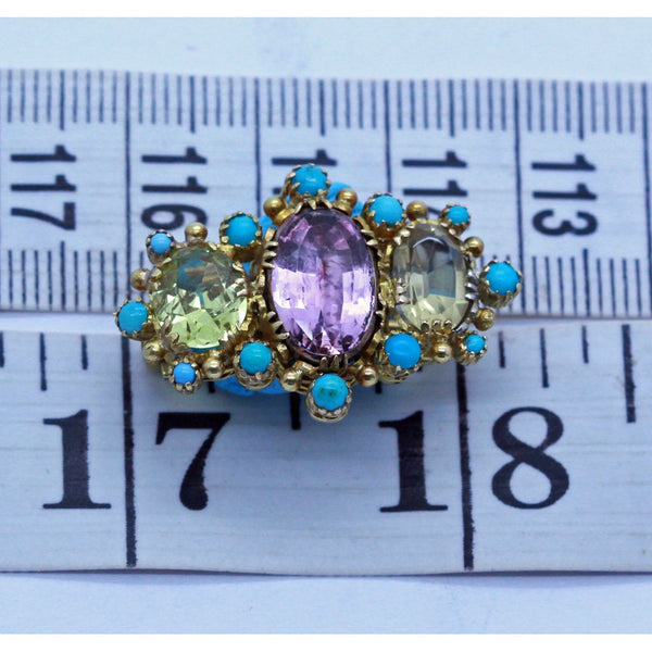 Description : Bright and lively small brooch. A trio of colorful gems in a row. The central, largest stone is a pink topaz, closed at the back. It is flanked on either side by a pair of gleaming, lemon yellow chrysoberyl and a smoky quartz on the other side. The perimeter surrounding the larger gems consists of alternating gold globules and turquoise, giving a lacy effect which contrasts with the strong statement of the gems. The turquoise cabochons are set above high cylinders of gold openwork that are formed of 3 bands - a gold ring at the bottom, openwork gold circles in the middle and the zigzag upper section that actually holds the cabochons. All of this is supported by an openwork trellis, similar to the mounts of the turquoise. These together with the golden spheres are what give the effect of cannetille. The brooch pleasantly combines the solidity of the central gemstones and the busy, lacy look of the border.
