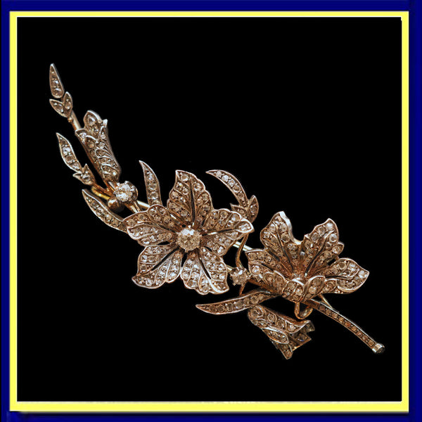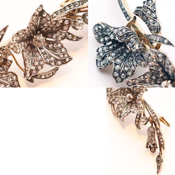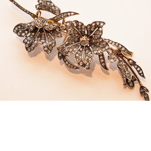 Whereas most Victorian fine jewelry has a thin layer of gold behind the silver-mounted diamonds, this brooch has the very large majority of the brooch in gold with only a fine layer of silver to show diamonds off to best effect.