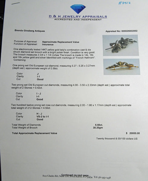 Weight is 30.1 grams. 3 7/8 inches (11.5 cm) long. Total diamond weight 5.50ct. Old European cut and rose cut diamonds.