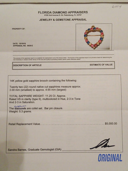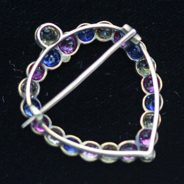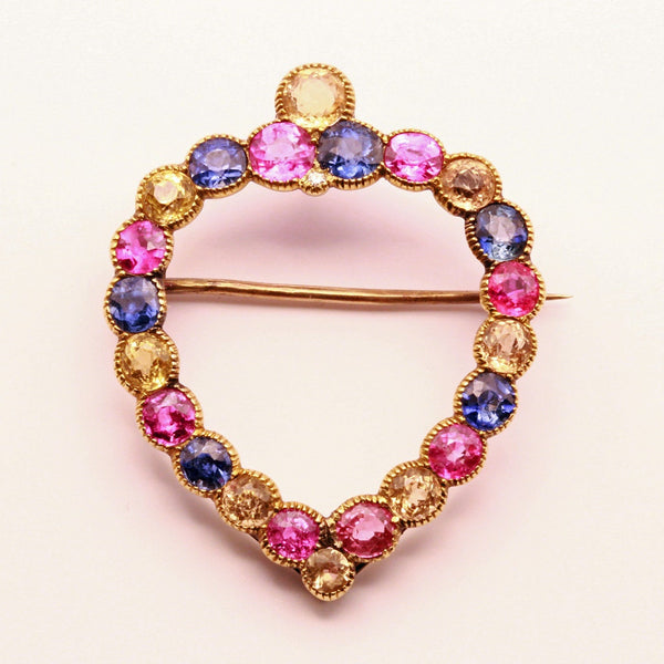 Description: Heart shaped brooch with a small sapphire as a 'crown' on top. Blue, bright pink and yellow sapphires blaze in a heart contained in gold mounts. Fabulous colors. Simple c-clasp is consistent with Victorian jewelry. Independently appraised as having a value of $5000.00 (prices risen significantly since appraisal).