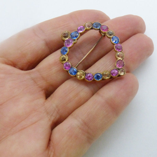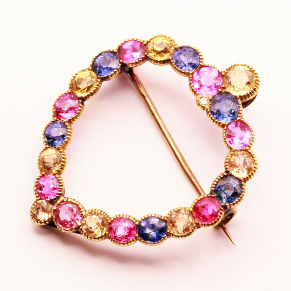 Antique Victorian brooch pin. 14k gold and multi colored sapphires. Made late 19th century.