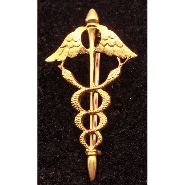 Description : The caduceus was the symbol of the Greek god, Hermes and became the symbol for medicine and doctors in later years. This is a particularly lovely caduceus, entirely worked in 18k yellow gold. The symbol with a golden staff in its center, upon which a pair of serpents wind. Bodies of the snakes are graduated in size and form loops as the snakes twine around one another. Smallest loop at the bottom. Unusually fine engraved detail to bodies of snakes, giving scaley, naturalistic effect. The heads of the snakes curve in opposite directions, forming a large U shape, the final loop in the body of snakes. Fabulous deatil to the heads of the snakes, from scales to eyes and forked tongues.