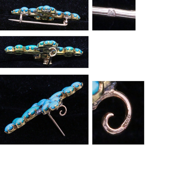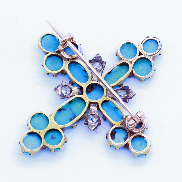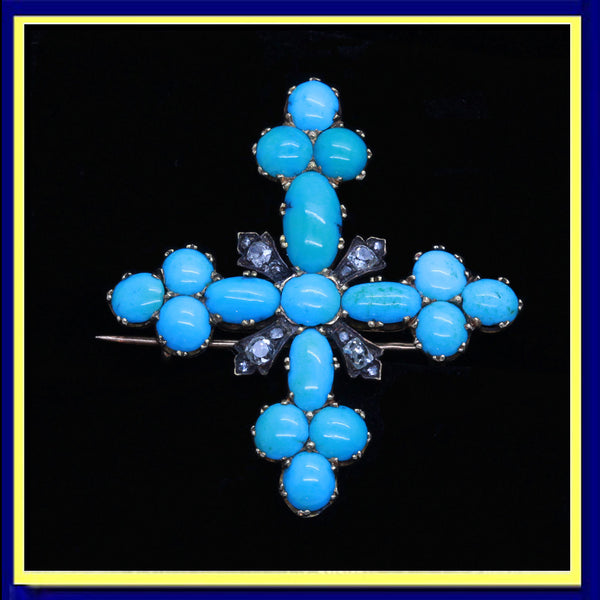 Description : Beautiful cross brooch composed of round and oval cabochon turquoise set in gold in a lively and interesting pattern. The center has diamonds radiating to the diagonals, set in slightly darkened gold. Typical of Victorian jewelry, diamonds are a combination of Old and rose cuts. Turquoise are cabochons. Turquoise have retained their lovely color for the most part, with very slight darkening of bottom arm. Sturdy C-clasp and pin.