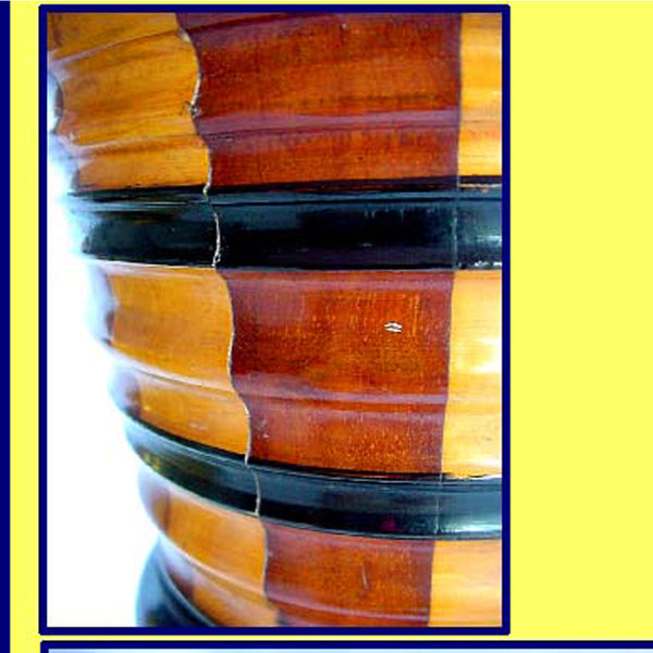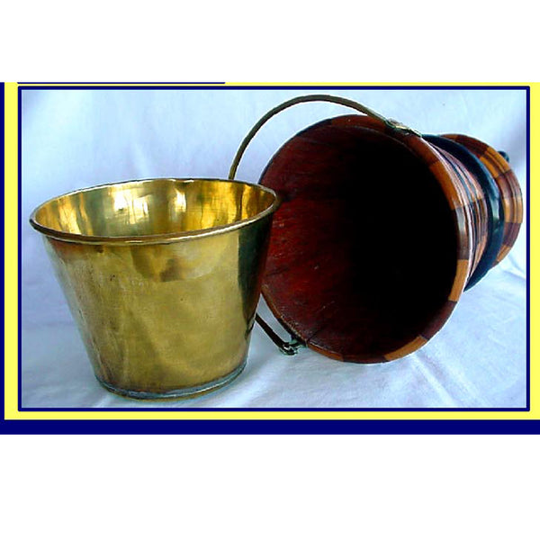 Bucket-shaped body, carved with horizontal folds and with alternating bands of light and dark fruitwood, interspersed by 3 ebonised ringbands. Stands on a conforming domed, round pedestal base raised on 3 ball feet. Brass swing handle on the sides have leaf-shaped attachments with copper studs. Original, matching brass liner.