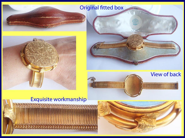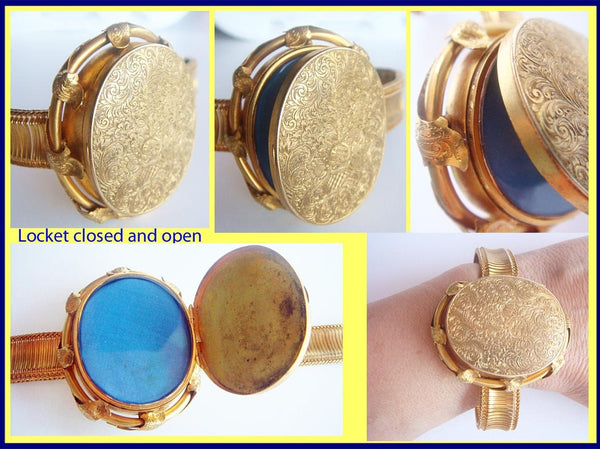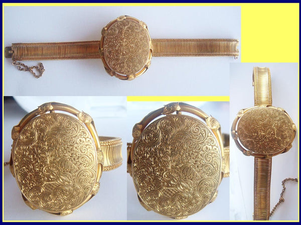 An exquisitely made strap, comprised of tightly set parallel links, joined by diagonal rope-twist border. In the center, placed on top of the wrist/arm is a locket. Surrounded by a rube of gold, attached by scrolling foliate links with engraved detail. The outer top of the locket is very finely engraved in a scrolling floral pattern. Clasp and hinge are in good order. The blue silk lined inner compartment is waiting for a fabulous 'photo or miniature portrait. A very similar pair of bracelets, was worn by Queen Victoria: one had her portrait and the other, which she never removed, the portrait of her beloved Albert. An easy to insert clasp and a safety chain make the bracelet convenient to wear and yet secure. Quality of workmanship is tops.