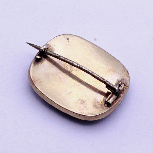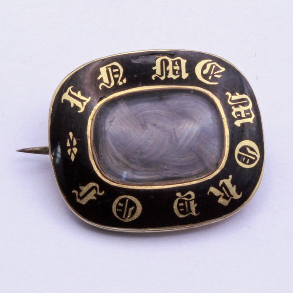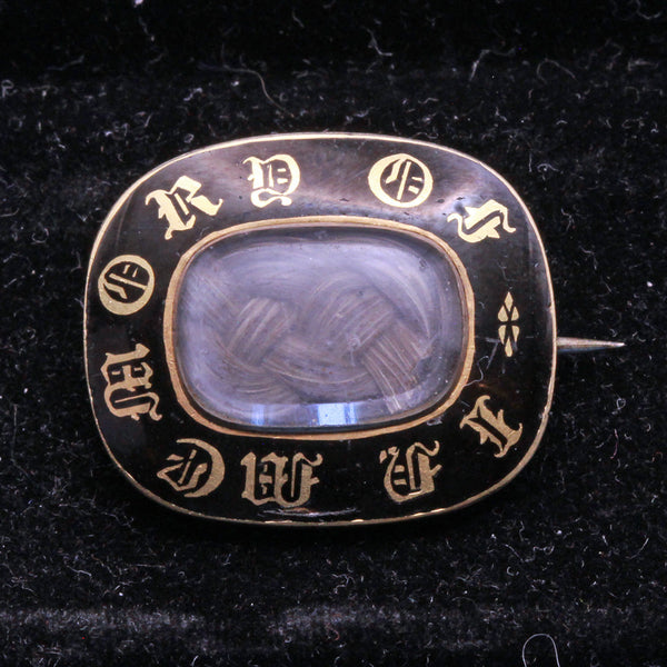 Description : Classic rectangle, with rounded corners. Gold borders around a black enamelled ground with gold lettering that reads IN MEMORY OF. Within is a bevelled glass compartment with a braided lock of blond hair of the deceased. Simple c-clasp with hinged pin.