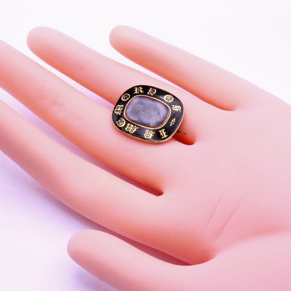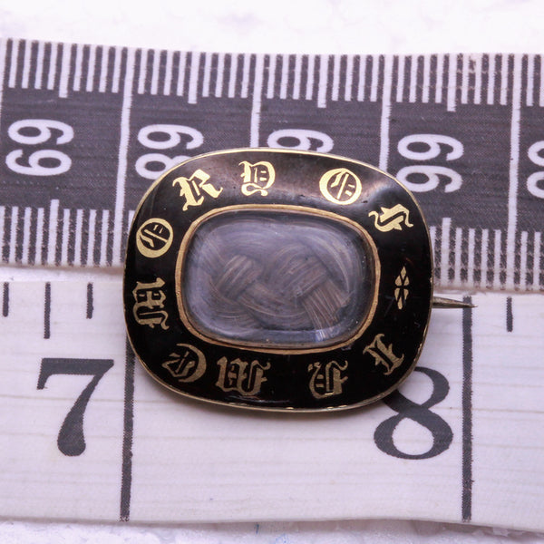 Antique Victorian sentimental Mourning Brooch. 10k gold, hair and black enamel. Made in England, United Kingdom, 19th century.