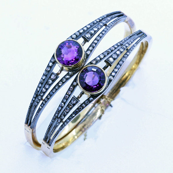 Description : Very solid gold bangles with upper section in silver, the metal used during Victorian times to show diamonds off to best advantage. The center of the tops are collette set in gold with faceted round amethysts from which run 3 tapering lines of rose cut diamonds, seemingly drizzling or melting away towards the sides. Tongue in groove clasps are very secure and small gold chains add additional security. Exceptional!!