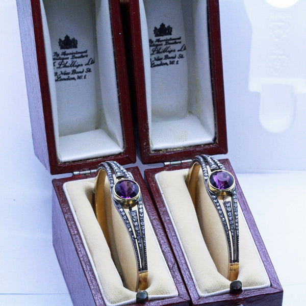 Antique Victorian pair of bracelets bangles. 18k gold, silver, amethysts, rose cut diamonds. Made in England 2nd half 19th century. Come with fitted cases by S.J. Phillips by appointment to the Royal Family and with original receipt from S.J. Phillips.
