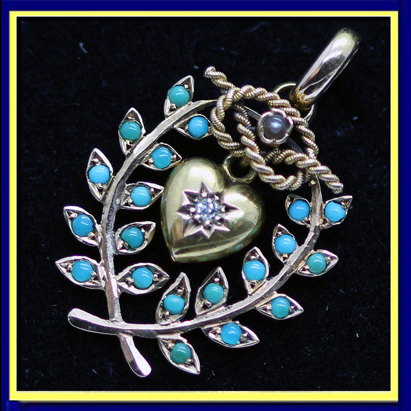 Full of Victorian symbolism, this pendant is as lovely and wearable today as it was about 150 years ago. It consists of a pair of mirror-image wreaths, the foliage set with turquoise in each leaf. Gracefully curving around a heart that swings from a loop suspended from a gold twisted rope in the form of a naval knot. A small natural seed pearl in a colette setting is set in the center of the knot and a diamond set in the heart. A large and sturdy bale allows the pendant to be hung on a delicate or heavy chain. Every aspect of this pendant is full of symbolism and romantic meaning. The color turquoise, reminiscent of forget-me-nots symbolised love, as did the heart and knot. Knots also indicated fidelity. The wreaths could have a naval significance, but were often associated with triumph or victory and might even be symbolic of the memory of a loved one.
