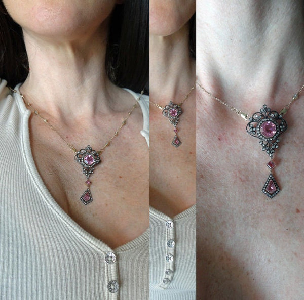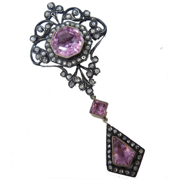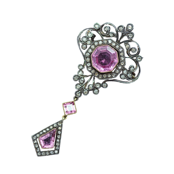 Classic 19th century French exquisite jewelry making. From the elegant, elongated design in parts, to the wonderful rare pink tourmalines, highlighted with diamonds, this is a marvelous item. Typical of French ingenuity and workmanship of the day, the jewel doubles as either a pendant to hang from a chain or ribbon, or a brooch. With the removal of a gold loop, the length and appearance can be altered yet again. Floral theme with scrolling bars of silver, in which diamonds were typically set, terminating in diamonds that imitate buds. Gold back. Loops allow parts to swing as the wearer moves.Great design, great workmanship and great materials.