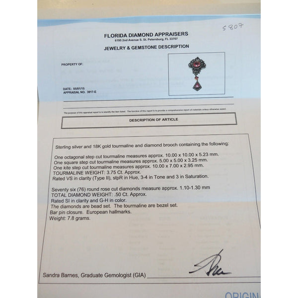 Measurements: total length is approximately 2 3/8 inches (61mm). Weighs 7.8 grams. 3.75ct tourmalines; 0.50ct diamonds.