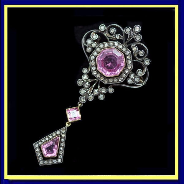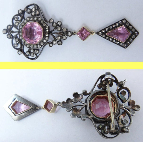 Antique Victorian pendant brooch. 18k yellow gold, silver, pink tourmalines and diamonds. France circa 1890's.