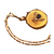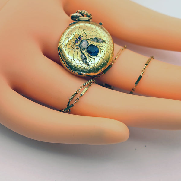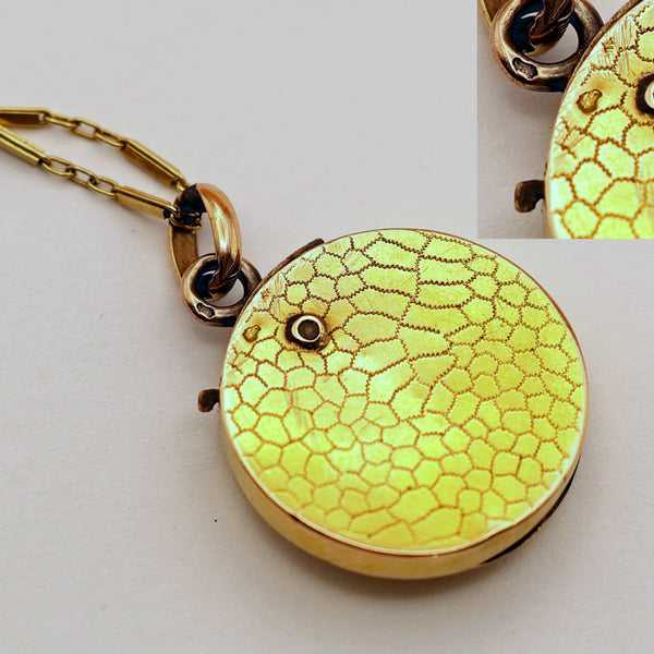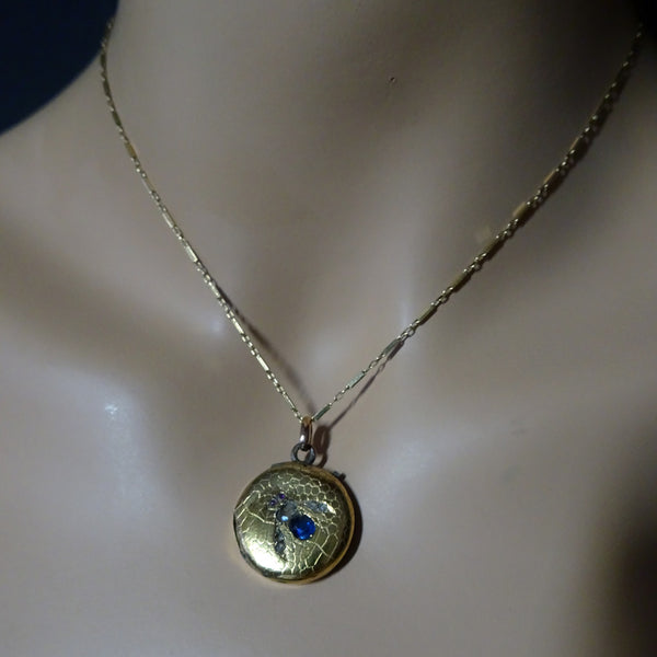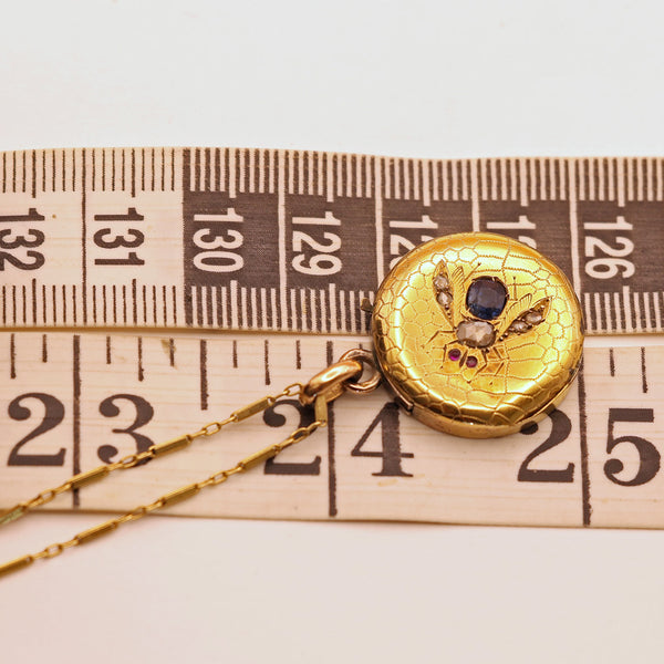 Round pendant with rich gold surface. Front and back, gold engraved with a pattern that resembles a honeycomb pattern or the scales of a little reptile. The top with an inset depiction of a fly or other insect : Deep blue sapphire abdomen; rosecut diamond body and rosecut diamond wings; red cabochon eyes too small to test. Further engraved detail such as legs.
