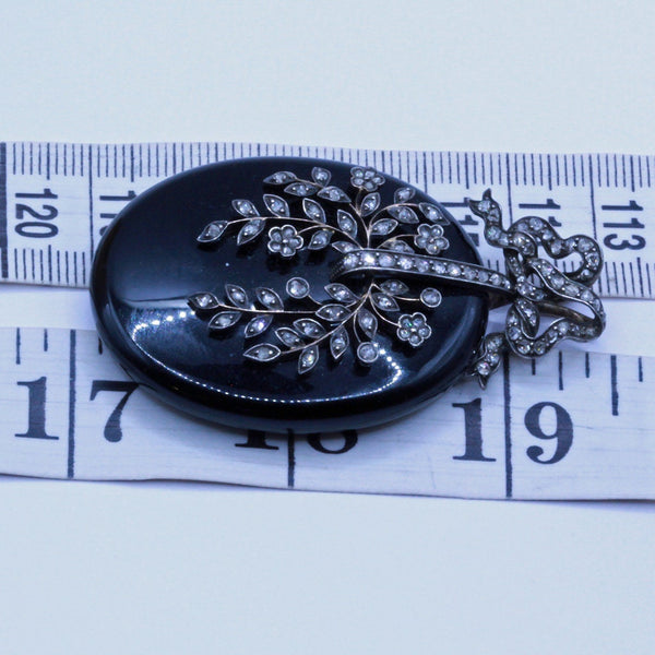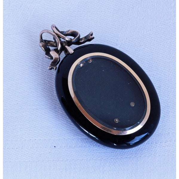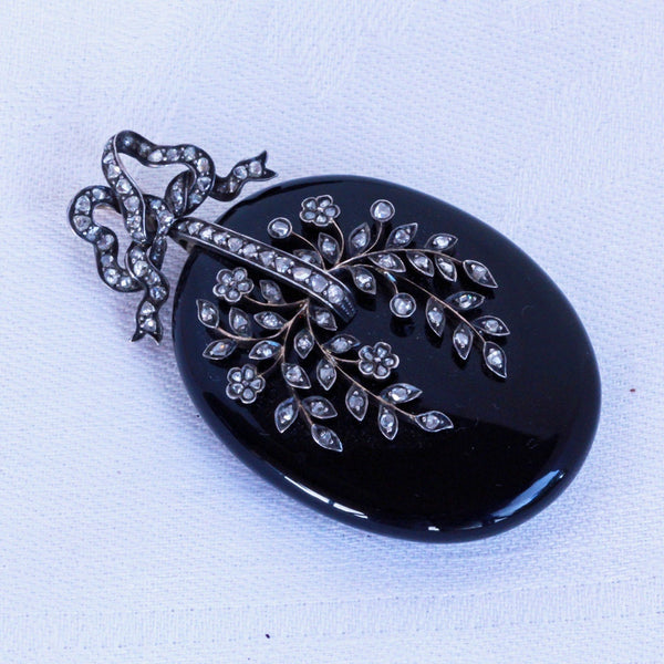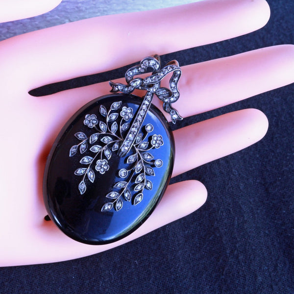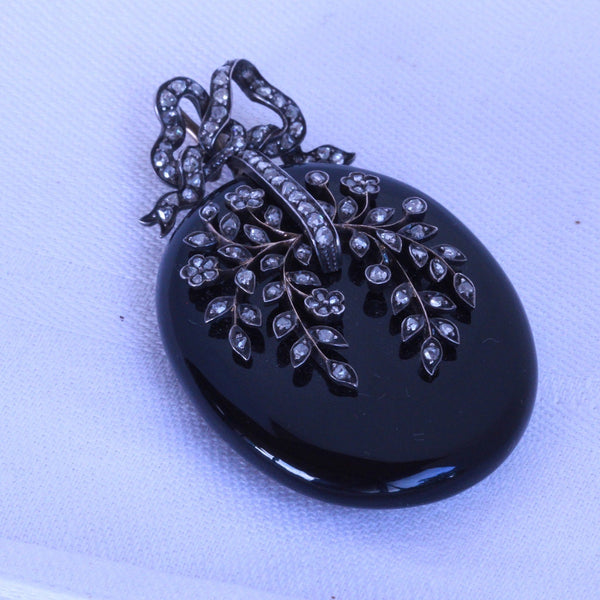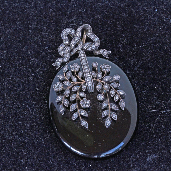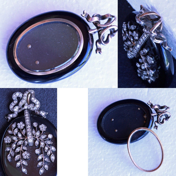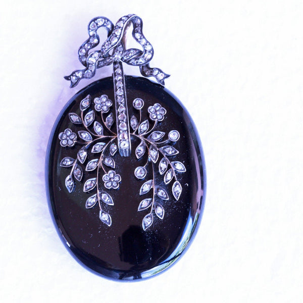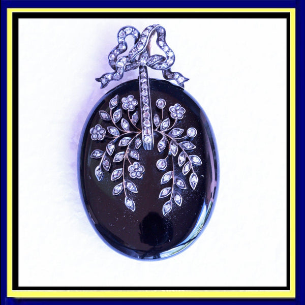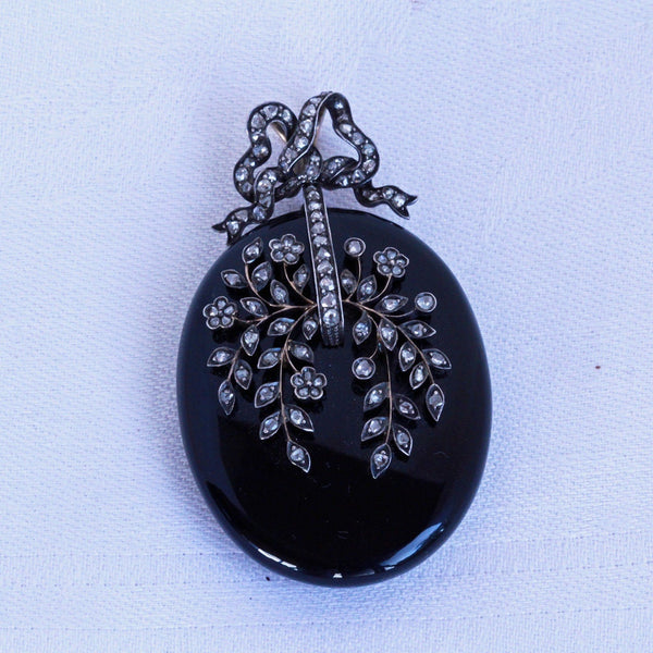 Description : Exceptionally beautiful and elegant pendant locket. Carved from timeless, polished black onyx, the locket is a large, rounded oval. It is suspended via links from a bow surmount, which could be removed and there is a large loop at the top of the locket from which to suspend it. The bow with double gold, large loops, making it possible to thread a large chain or ribbon through them. The bow and the face of the pendant are pave set with rose-cut diamonds. The diamonds follow the shape of the ribbon of the bow. On the pendant, they form a botanical design of exquisite delicacy with tiny flowers and foliage gently arching over the surface. Gold wire work suspends the silver set diamonds - it must have been painstaking work to produce this fine combination, but the result is fabulous. Links connecting top and bottom allow a fair amount of movement between them. The back of the pendant has a large, glazed compartment to hold a portrait or lock of hair. It is contained in a gold frame that sits securely in the mount, but can easily be removed to place/remove the contents of the locket.
