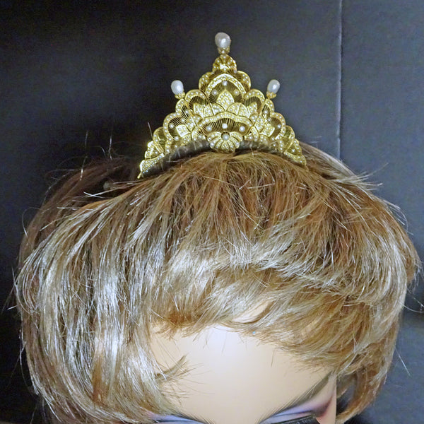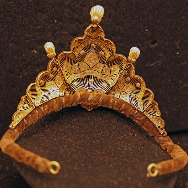 The tiara has a velvety-covered curved band attached to its arched, lower edge. It can easily bend to suit the shape of the head or accommodate the hairstyle. The sides end in gold loops that can be tied to ribbons or clips to further secure the tiara / diadem on the head.