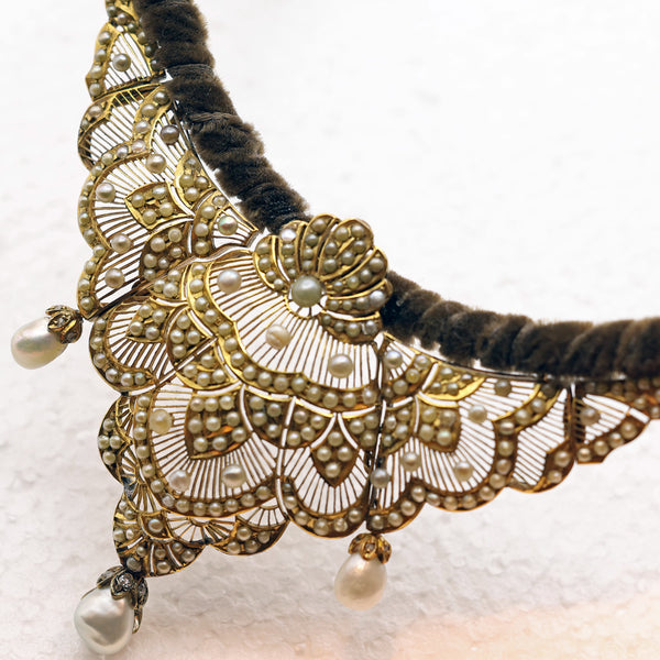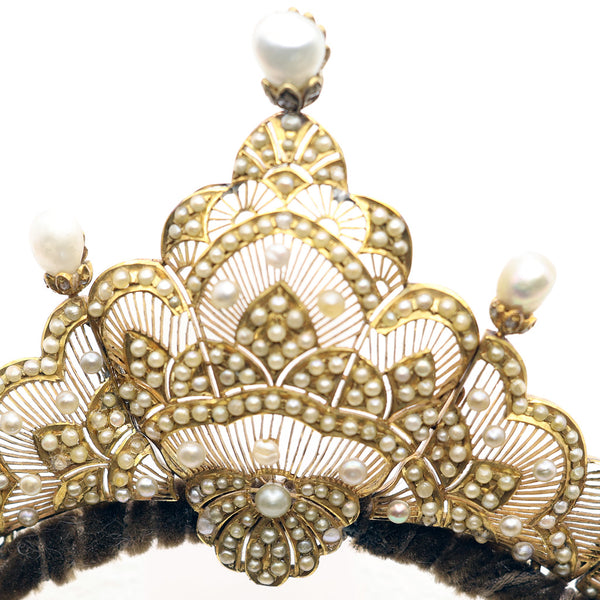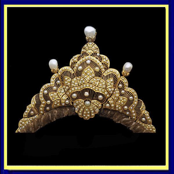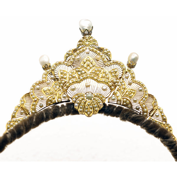 Antique tiaras are rare. Worn as symbols of rank, status and style, the history of tiaras encompasses royalty and nobility and offers us insights into the grandest courts.A tiara with natural pearls is a true find. THroughout history, natural pearls were a rarity. One in thousands of molluscs went through the arduous process of placing thin layers of nacre, one over the other to produce the natural pearl. Over a hundred years ago, a pearl necklace was exchanged by Cartier for an entire Manhattan city block and building. The ultimate symbol of power and wealth for the likes of Queen Elizabeth I, was the pearl.