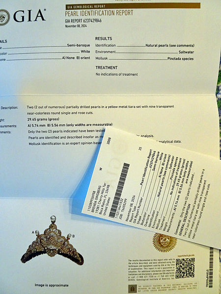 Natural pearls are no longer produced thanks to the pollution that we have caused in the oceans. Currently, there is a frenzied trend desperately seeking out these rare gems of Mother Nature. They are now more sought after than diamonds and prices are steadily rising - already having reached breathtaking amounts. While we did not test each tiny pearl in this tiara, we did have the largest pearls tested by the GIA and the certificate, stating that these are natural, salt-water pearls will go to the new owner.