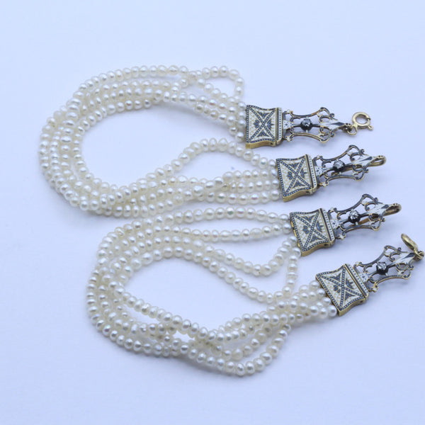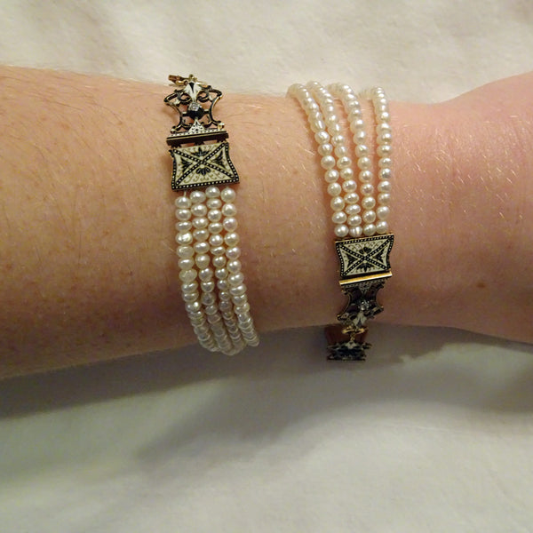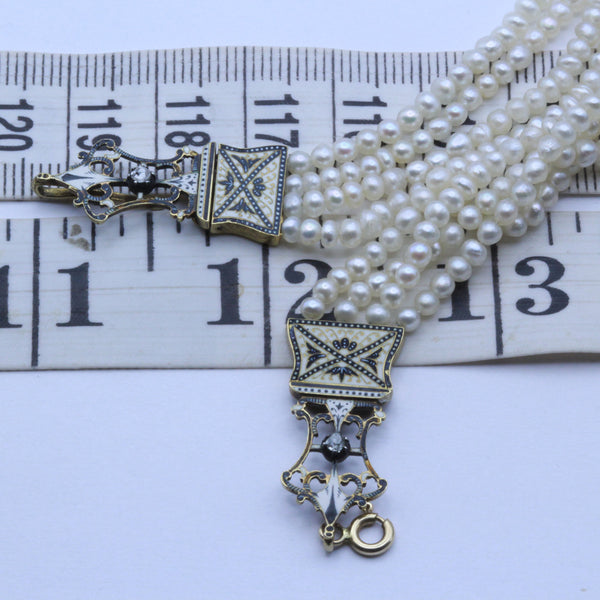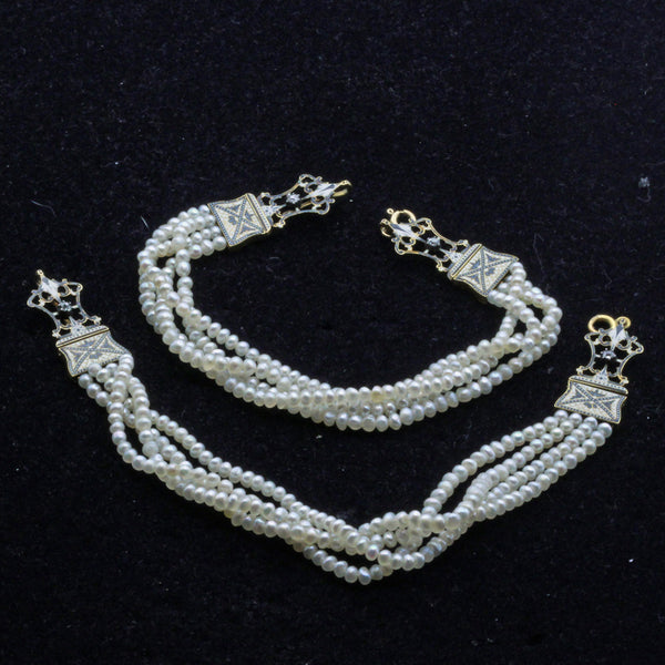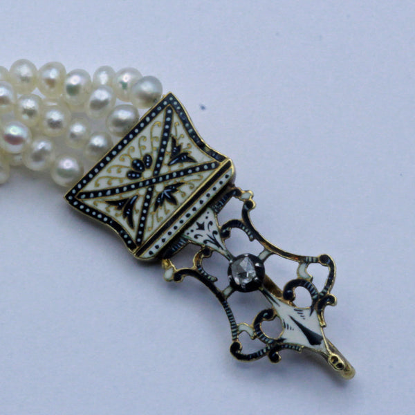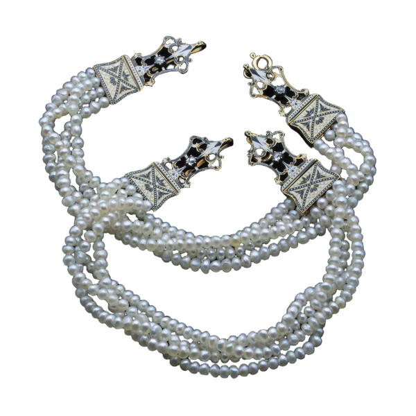 Description : A pair of late Victorian wedding bracelets. Each bracelet composed of 4 strands of small pearls, attached at either end by gold, enamel and diamond terminals. Enamel in very fine, black and white design with gold highlights, which is almost a signature of the Giuliano family. Partially solid and partially openwork with a central Old European cut diamond set in silver.