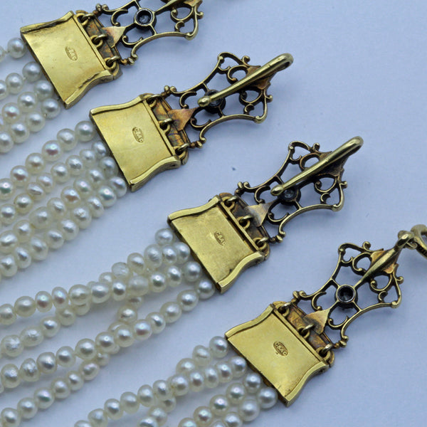 Antique Victorian Renaissance Revival pair of bracelets. 18k yellow gold, pearls, enamel, diamonds, a small amount of silver. Made in England, Great Britain, circa 1890's. Suitable for a wedding / bride.