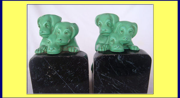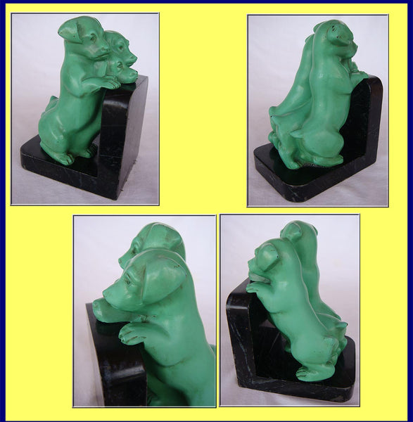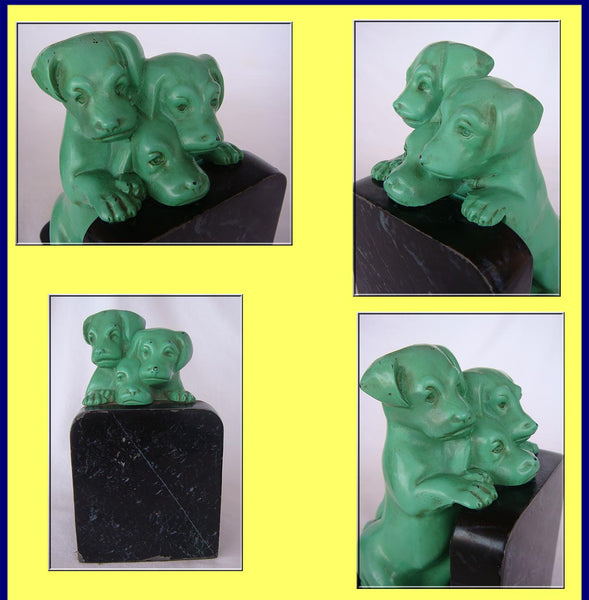 Delightfully whimsical, this vintage pair of painted metal bookends captures the endearing curiosity of playful pups. Each piece features a trio of puppy dogs—stacked one atop the other—standing on their hind legs as they eagerly peek over a faux marble wall. Cast in metal and painted in a muted green hue, the figures exude nostalgic charm and character from the early 20th century.