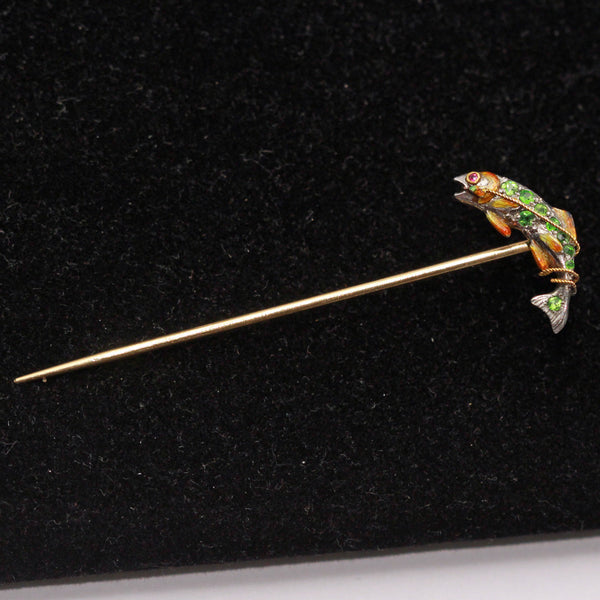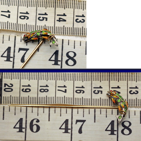 Description : A small stick pin, perfectly formed as a fish, the body arching and curving, possibly as it is pulled from the water or dives to the depths.