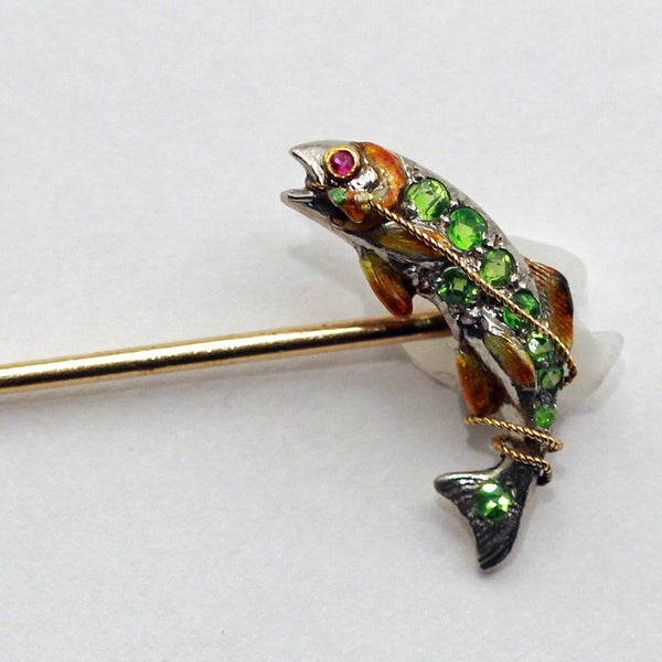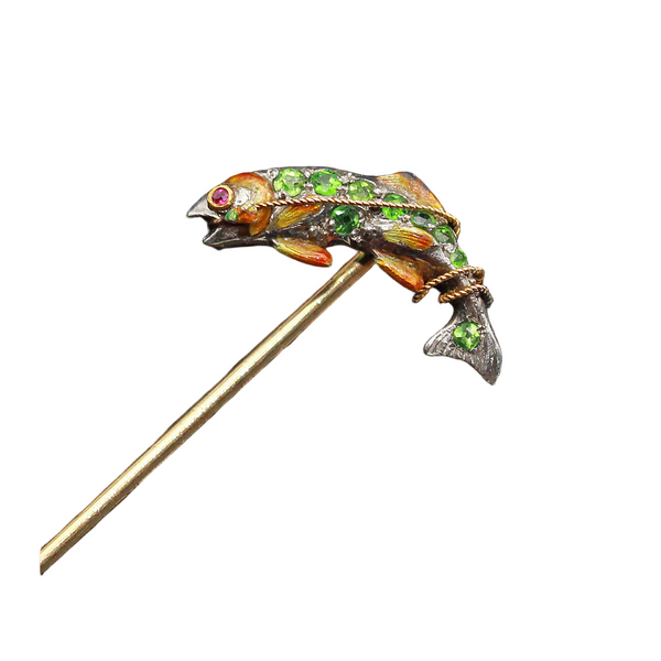 The body set with bright green, rare demantoid garnets and highlighted with gleaming enamel. The combination is a shimmering sense of movement. A gold twisted wire coils around the body of the fish. Eye is set with a tiny ruby.