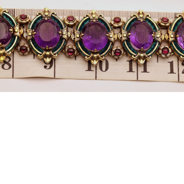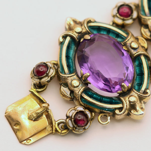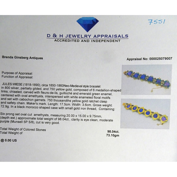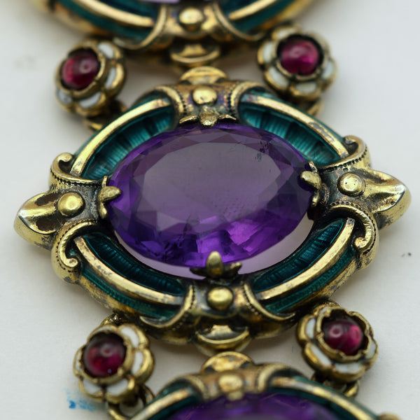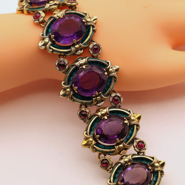 Medieval/Renaissance/Gothic Revival antique Victorian bracelet. Gold, silver, amethysts, garnets, enamel. Made in Paris, France, circa 1850 - 60 by Jules Wiese. Signed.