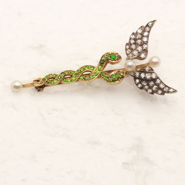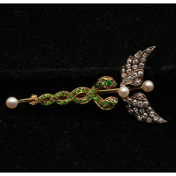 Antique Victorian brooch pin in the form of a caduceus with wings and snakes. Gold, some silver, diamonds, demantoid garnets and pearls. Made 19th century (circa 1880 - 1900).
