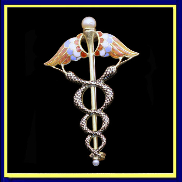 Description : The caduceus was the symbol of the Greek god, Hermes and became the symbol for medicine and doctors in later years. This is a rare example, combining rich 18k yellow gold and fabulous enamel work. Like every other caduceus, the brooch has a central staff or pole in the center. Pearls set at either end. Pearls untested.