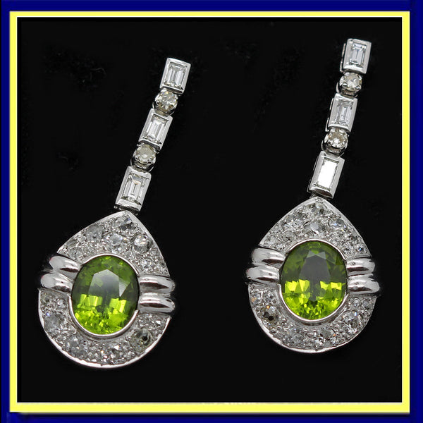 Vintage Retro era earrings / ear pendants. Platinum diamonds and peridot. Made circa 1950. Bought in London.