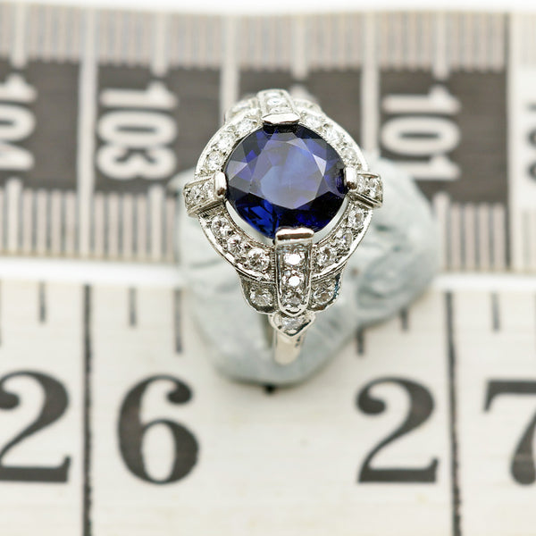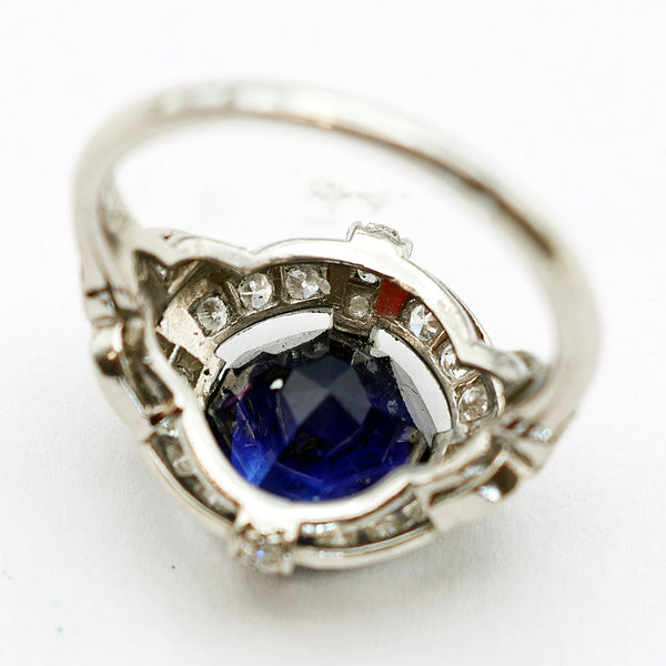 Antique Art Deco ring. Platinum, diamonds and blue sapphire. Made in the USA circa 1920-30's.