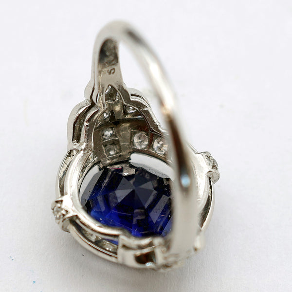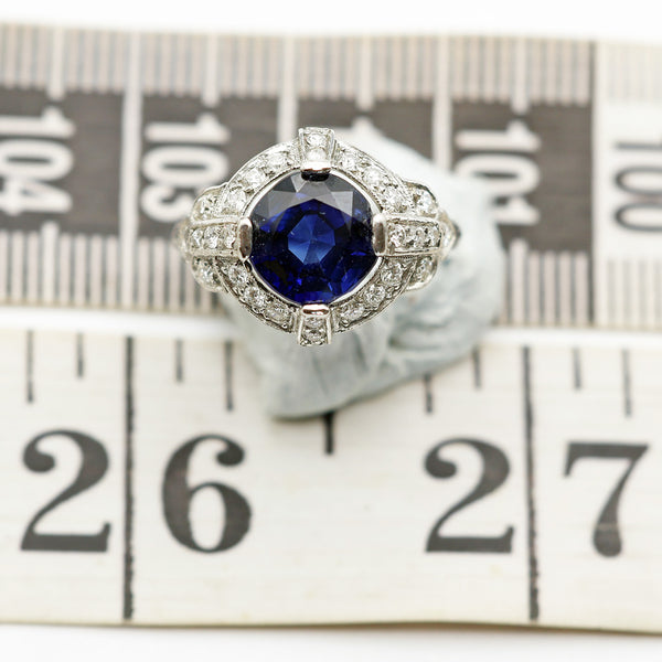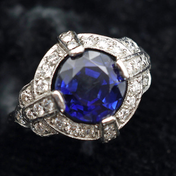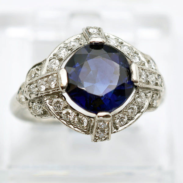 Luscious, cushiony deep blue sapphire. Surrounded by a floating ring of pave-set diamonds with bands of diamonds, identically set at the cardinal points, securing the sapphire to the diamond ring. Diamonds set in platinum with millegrain edges. Bands on sides meet up with fluer-de-lis - 3-part shoulder, also set with diamonds. Simple platinum shank.